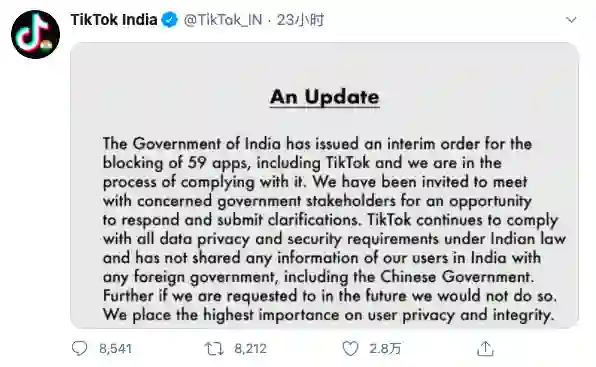 TikTok印度负责人Nikhil Gandhi 通过Twitter发表一则声明,公司遵守印度法律规定的所有数据隐私和安全要求,没有与任何外国政府分享任何用户信息,包括中国政府。未来即使有人要求,我们也不会这样做。我们一直把用户隐私和安全放在首位。
