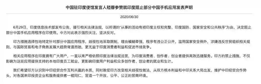 中国驻印度大使馆发言人嵇蓉在一份声明中回应: 印方选择性地针对部分中国应用程序,歧视性地采取限制,理由模糊牵强,程序有违公正公开,滥用国家安全条例,涉嫌违反世贸组织相关规则。并补充「这项禁令将影响印度就业机会」。