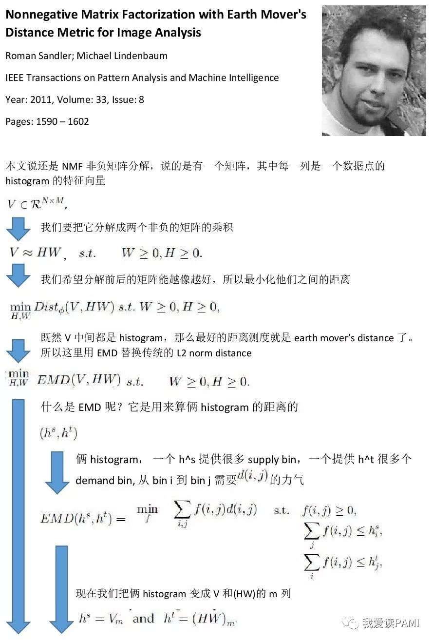 这篇文章讲的是非负矩阵分解,但是分解的结果跟原来的矩阵的距离用的是推土机距离。作者是以色列的Roman Sandler。
