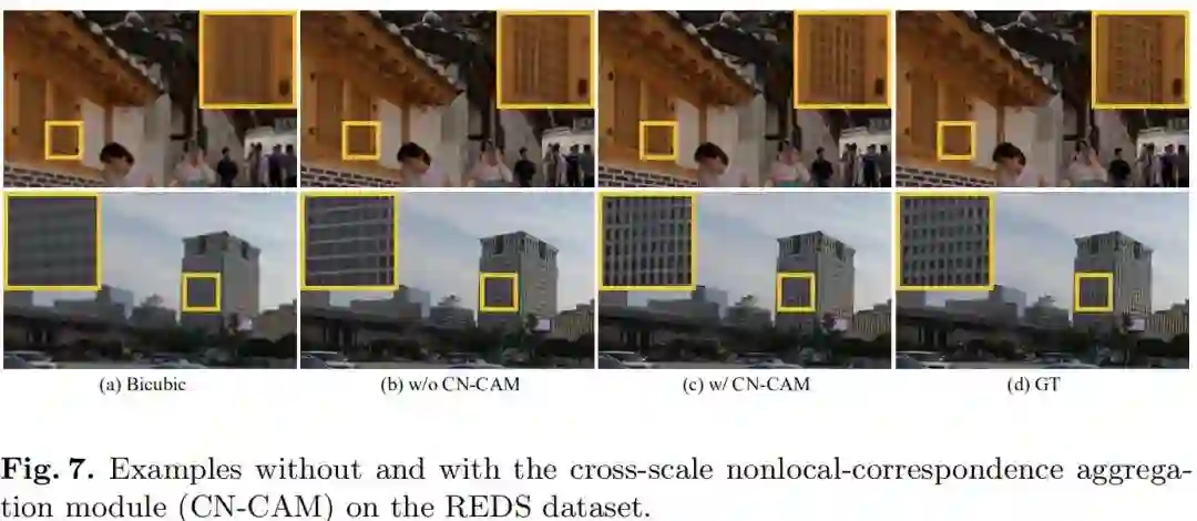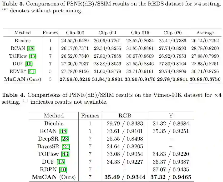 最后,我们再来看一下所提方法与其他SOTA方法的性能对比。从表中结果可以看到:(1)在REDS数据集上,MuCAN以至少0.17dB指标优于其他方法;(2) 在Vimeo90K-Test数据集上,MuCAN以1.2dB(RGB空间)指标优于DUF。