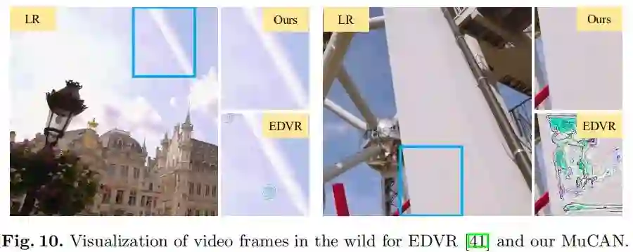 最后的最后,作者对比MuCAN与EDVR的重建效果,见下图。可以看到:EDVR生成的图像在某些情况下会存在伪影问题,而MuCAN则不存在该问题。
