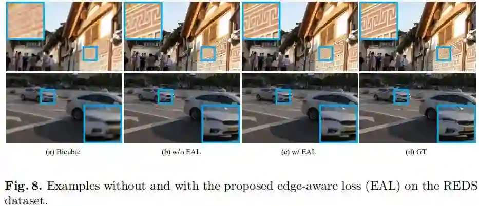 已有视频超分方案在重建的高分辨率图像中边缘往往存在锯齿问题,为缓解该问题,作者提出了一种edge-aware损失以更好的调整边缘。首先,采用边缘检测器提取GT图像的边缘信息;然后,对于边缘区域赋予更多的损失权重以迫使网络在这些区域赋予更多的注意力。