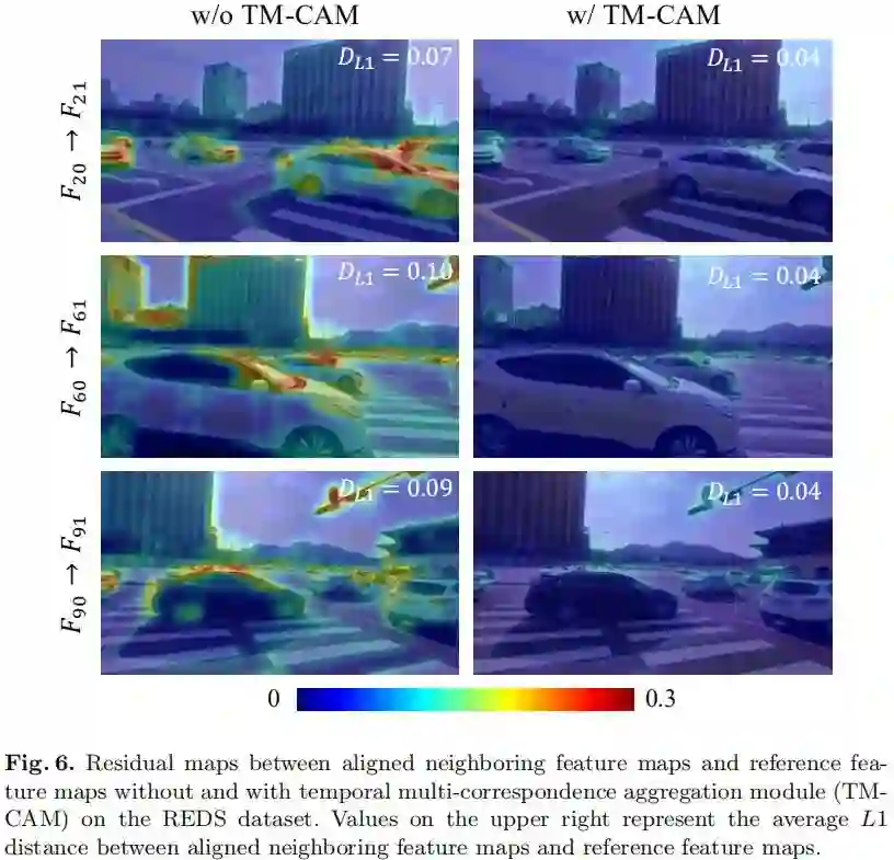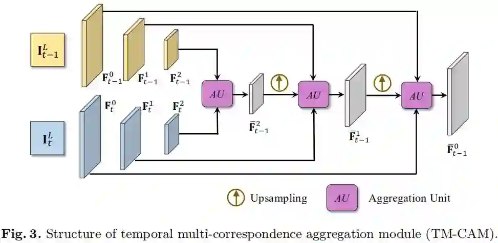 通过重复上述过程2N次,我们将得到一组对齐特征 。为处理统一特征层面的所有帧特征,我们采用了一个额外的TM-CAM用于自集成并输出 。最后,所有特征通过卷积和PixelShuffle进行融合得到高分辨率特征。