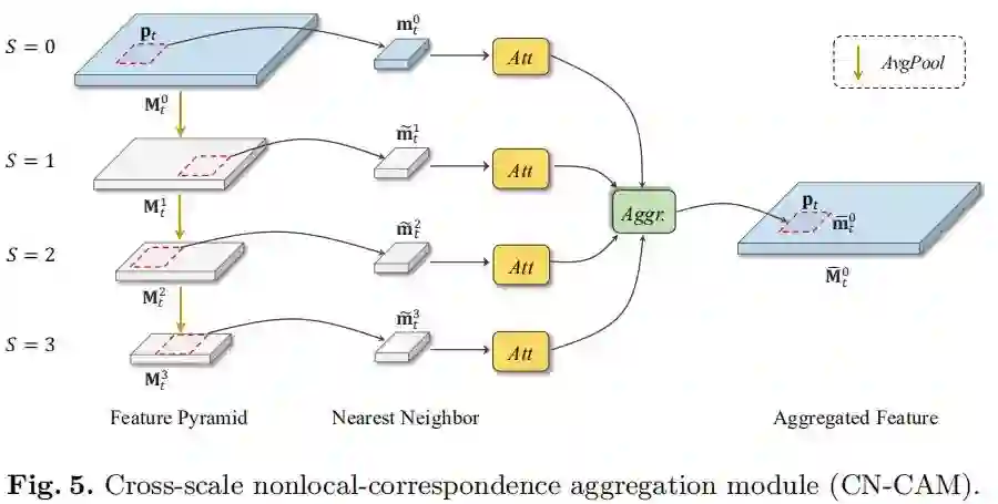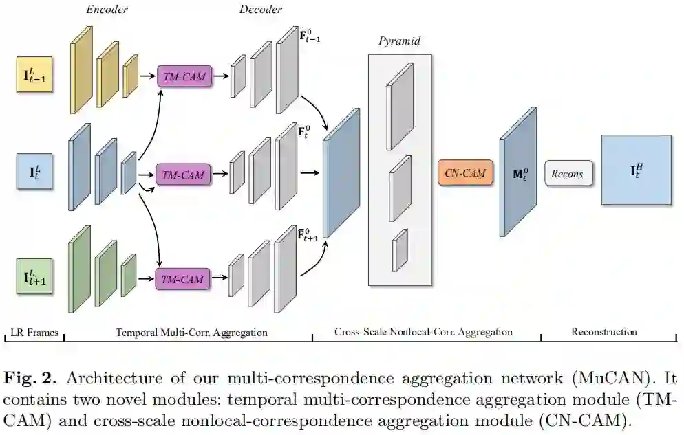 上图给出了本文所提出的MuCAN网络结构示意图。它以 个连续低分辨率图像 作为输入,输出中间帧的高分辨率图像 。它包含三个关键模块:TM-CAM、CN-CAM以及重建模块。接下来,我们将分别针对三个模块进行详细介绍。