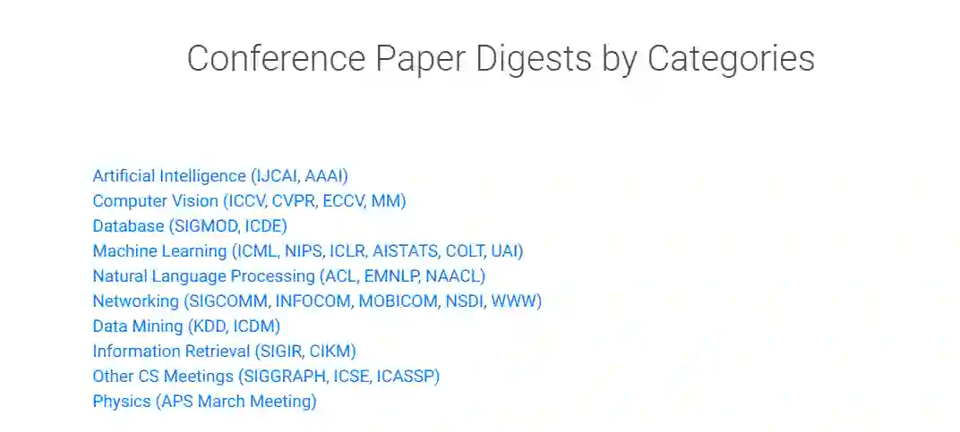 最近一段时间,Paper Digest 网站以“论文的一句话摘要”成为了计算机领域学术圈关注和讨论的话题之一。该网站按照不同的研究方向对计算机领域的一些热门顶会进行了分类(如下图),并且根据论文的引用量,在部分顶会的“最具影响力论文”板块中对收录的论文进行了影响力排名。该排名实时变动,且每一届顶会只评选引用量靠前的10-15篇论文。
