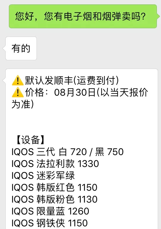 张力(化名)就是一名专门做IQOS电子烟批发的卖家,每天在朋友圈上更新若干条产品内容。当第一财经1℃记者询问他是否有IQOS电子烟卖的时候,他即刻就发来了一张IQOS电子烟的价格清单。
