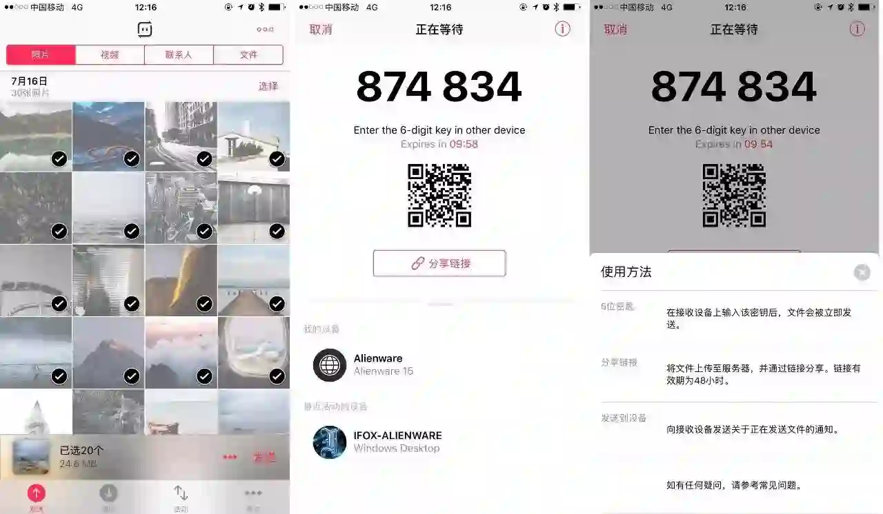 值得注意的是,6 位数字和二维码都会保存 10 分钟,如果在 10 分钟之内还未被任何设备接收,则本次分享作废,需要重新分享。