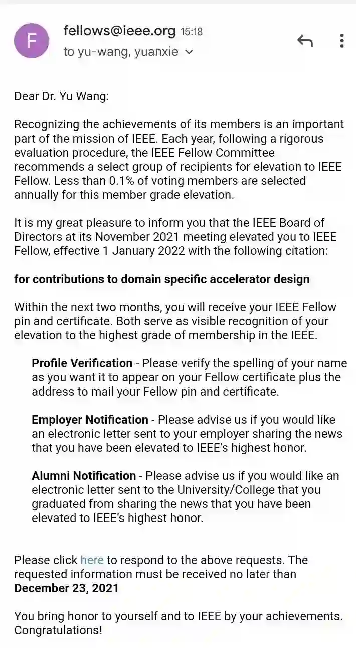 39岁清华大学电子工程系主任汪玉当选2022 IEEE Fellow,以表彰他对领域专用加速器设计做出了贡献。