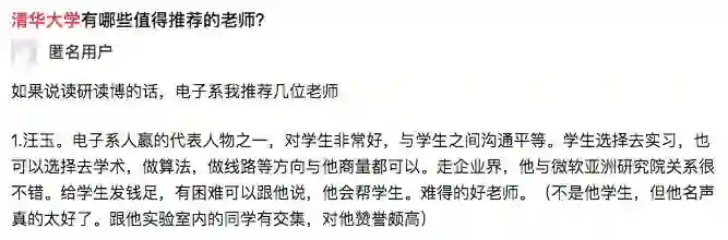 汪玉教授也是学生眼中喜欢的好老师。一位知乎网友曾在「清华大学有哪些值得推荐的老师」这一问题下推荐汪玉,口碑可见一斑。