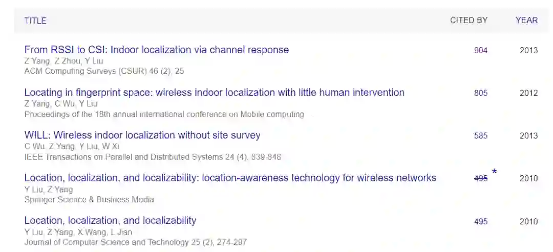 其中,他被引用数最高的一篇论文是2013年发表在 ACM Computing Surveys 上的《From RSSI to CSI: Indoor localization via channel response》,目前已被引用904次。