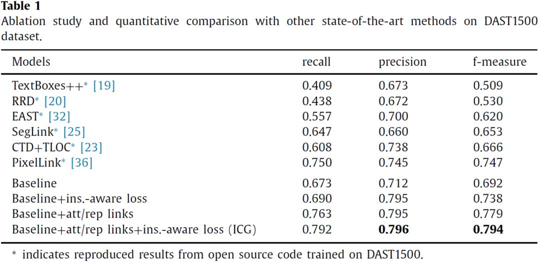 从Table 1来看,文中的方法在商品密集行数据集DAST1500上取得了优异的性能,大幅领先同时期的其他方法。从方法自身的对比来看,在Baseline基础上引入文字块单元间吸引和排斥的关系表征以及Instance-aware Loss都能有效提升密集文本检测效果。