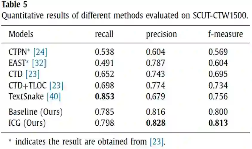 对于Table 2,文中的方法在ICDAR15多方向文本检测数据集上取得较好的结果,而且检测效率也不错。另外对于Table 5,在CTW1500曲形文本检测数据集上,本文的方法也取得很好的结果,优于同时期的其他方法。