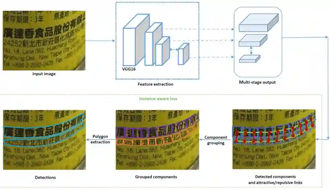 现有的自下而上的文字检测方法存在两个问题:一是难以区分密集文本,二是自下而上的方法通常需要一定的后处理进行单元组合,而这个后处理过程一般不能和网络一起进行端到端的训练。为了解决这些问题,该论文首先提出了一种文本块单元之间的吸引关系和排斥关系的表征,然后设计了一种最小生成树算法进行单元组合得到最终的文本检测框。另外,该论文还设计了Instance-aware Loss损失函数,把文本行实例的信息引入到文本块单元的训练过程,实现了后处理过程和网络端到端的训练。