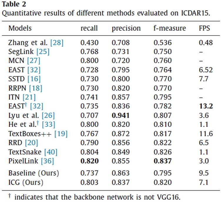 本文提出了一种Instance-aware Component Grouping(ICG)的自下而上的文字检测方法,实验证明该方法在检测不规则密集文本上的有效性和优越性。ICG中文字块单元之间吸引和排斥关系的表征,以及对文字行实例敏感的Instance-aware Loss,都能够显著改善自下而上的文字检测方法的检测效果。