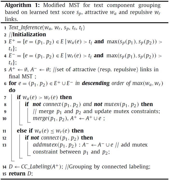 然后设计了一种最小生成树算法进行文字块单元组合,算法伪代码如图3所示。具体的算法流程是,按照吸引关系和排斥关系的强弱值从大到小考察每个关系。如果是吸引关系,则其连接的两个文字单元属于同一个文字单元组;如果是排斥关系,则其连接的两个文字单元之间有一个排斥的约束。遍历所有有效的文字块单元关系,可以得到组合好的文字块单元组,对应图2中,不同的文字块单元组用不同的颜色表示。最后,利用每组文字块单元,可以提取出对应的文字区域的外接检测框。