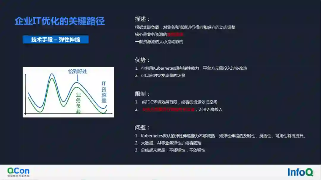 弹性伸缩是根据实际负载,对业务和资源进行横向和纵向的动态调整,它的核心是业务资源的按需使用,一般资源池大小是动态的。所以它有两个限制条件,一是纯 IDC 环境效果有限,缩容的资源依旧空闲;另外是业务方需要进行微服务化改造,无法无痛接入。