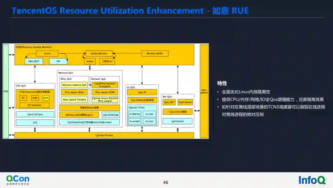 但是它同样也是有限制的,首先,总资源池大小固定,无法应对流量突发的场景;其次,需要有离线业务能够填补在线低峰。在腾讯云的在离线混部实践中,提出了如意 RUE 的解决方案,它能够让机器分别部署高优业务和低优业务,当高优业务起来的一瞬间,能够对低优业务进行绝对的压制,并且对在线业务零干扰。最终,能够使资源利用率提升 60%-70%。