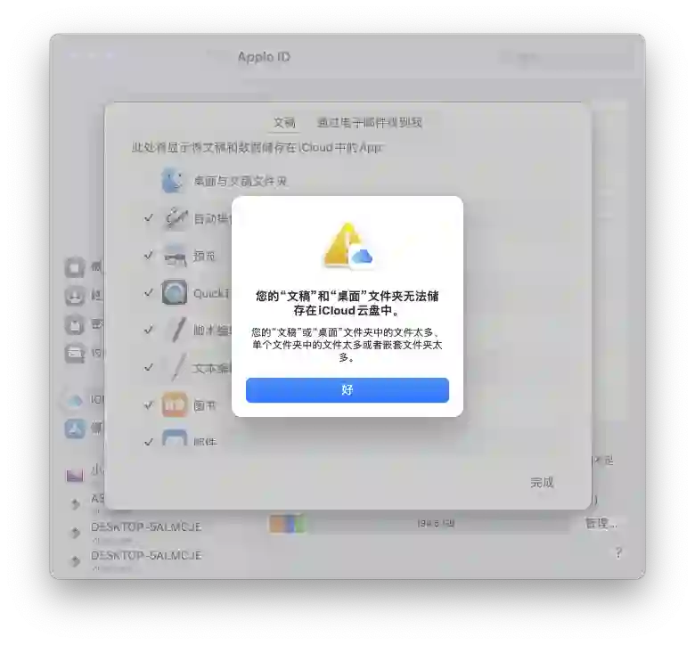 其次,如果你一次性向 iCloud 云盘塞入了过多需要同步的文件,iCloud 云盘进程在同步前就需要进行大量的计算和检索,花费时间会变长、占用资源变多,如果这时其中有一个文件有问题,很有可能会卡住整个 iCloud 云盘同步的进度。如果桌面或者文稿文件夹中有大量文件的 Mac ,突然打开了对应 iCloud 云盘的「桌面与文稿」同步功能,就非常有可能会出现这样前面提到的情况。