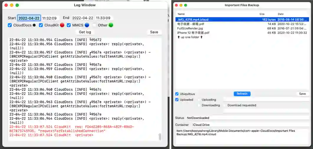 如果你不太适应终端,那么可以使用 Circus 这款小工具,来可视化 iCloud 中文件的同步进程。这款工具可以帮助你查看上文中提到的 log、查看当前 iCloud 文件的状态、下载当前 iCloud 云盘中存储的文件,或者是将存储在本地的 iCloud 文件清除。详细的使用方式,可以查看随附在 Circus 安装包中的文档,十分详尽,甚至列出了它的原理。