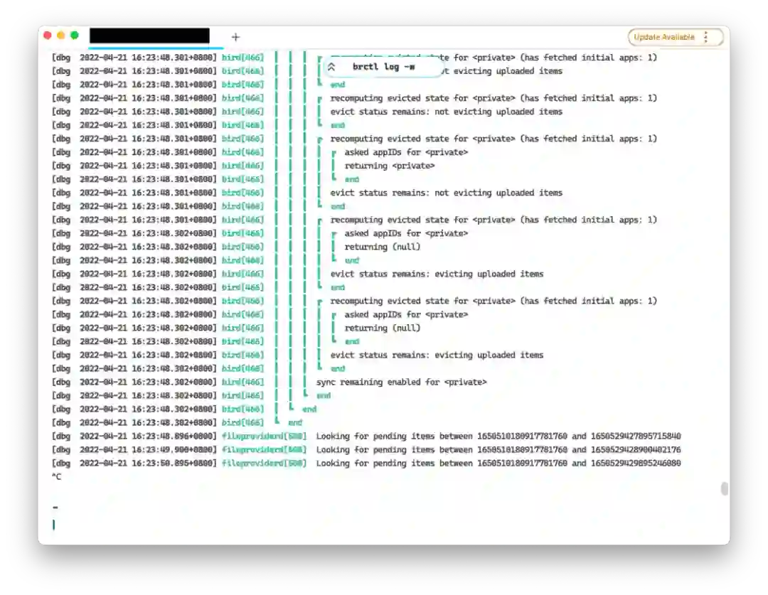 此外,还有一种更加靠谱的方式来检查你 iCloud 云盘同步是否出现了问题,即在终端里输入:brctl log -w 检查日志输出。