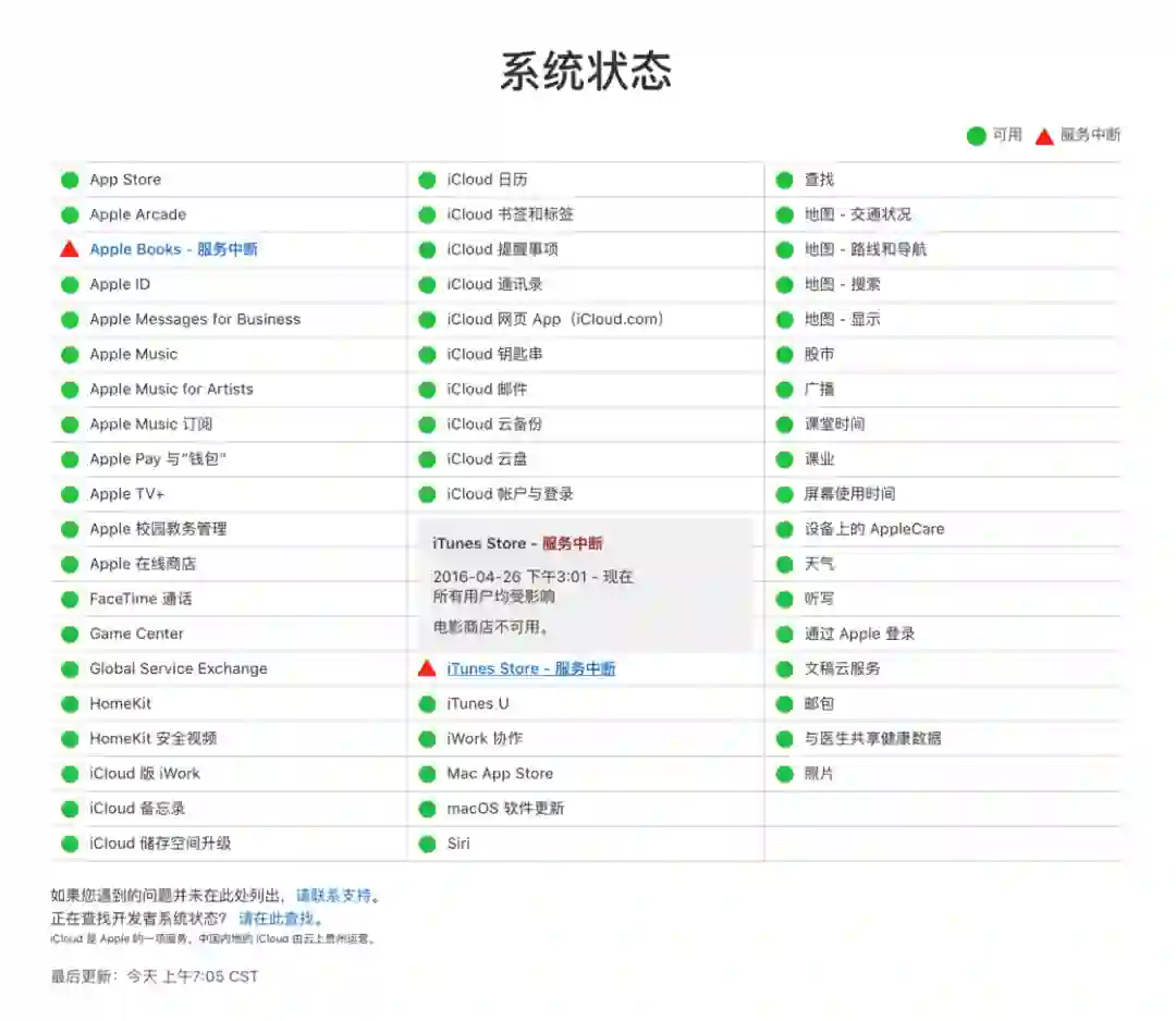 通过 Apple 官方的 系统状态 页面,可以查看 iCloud 服务的目前状态