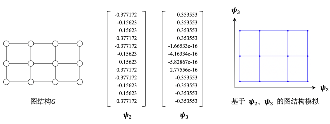 下图左侧展示了一个 的网格图,下图中列展示了该网格图拉普拉斯矩阵的第2、3个特征向量 (即 和 所对应的特征向量),下图右侧展示了 的可视化结果( 对应横坐标, 对应纵坐标),可以看到, 可以很好地模拟出一个网格图。