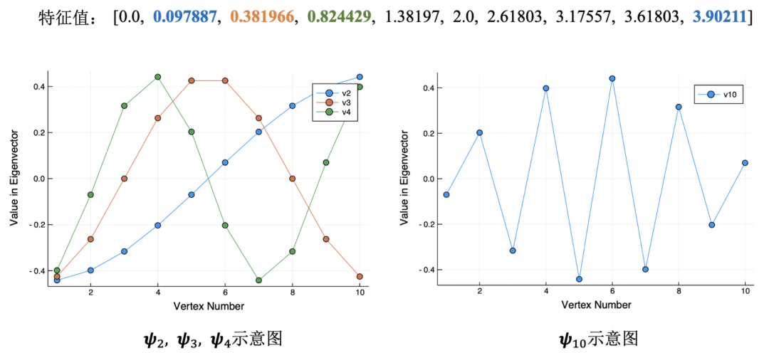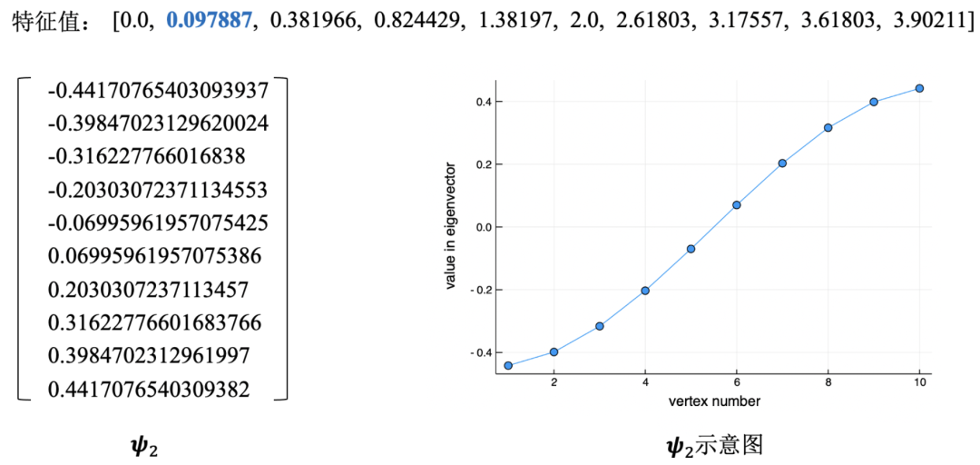 对于一个节点数为10的线状图 ,下图上方展示了图 的所有特征值(即 )。可以看到,最小特征值 ,与定理2.5所述相吻合。此外,对于次小特征值 所对应的特征向量 ,下图左边列出了 的具体取值,下图右边展示了 的可视化结果(图线上第 个点的横坐标即为 ,纵坐标为 向量第 维的具体取值,即 )。可以看到, 趋近于一条直线,即向量 的各维数值依次递增,且增长幅度近似趋同。