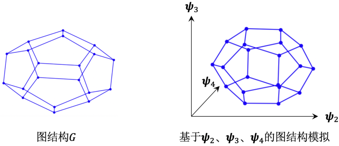 上述结论可推广至所有的正立方体图。例如,对于一个十二面体图结构,下图左侧为该图结构的示意,下图右侧使用该图结构拉普拉斯矩阵的第2、3、4个特征向量进行了图绘制,所得图结构亦可较好地模拟原十二面体图结构。值得注意的是,如果正立方体图结构的可视化结果需要在 维空间中展示,则需使用特征向量 对该图结构进行绘制。