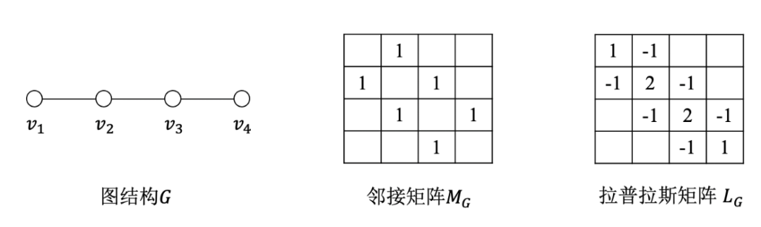 这一命名方式的背后逻辑可借助线状图结构进行直观理解。线状图(path graph)是一类特殊的图结构,其形状示意如下左图所示。更为具体的,对于一个含有 个节点的线状图(即图节点集 ),其连边关系可表示为 ( )。换言之,线状图上的节点依次连接(第 个节点与第 个节点之间有一条无向边),最后得到的图结构像一条直线。下中图、下右图分别展示了节点数为4的线状图的邻接矩阵和拉普拉斯矩阵。