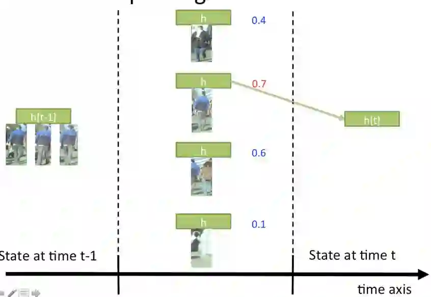 在顶层,我们设计了RNN,用来利用之前时间序列中的空间信息以及从当前时间点提取出来的图像特征。每一个时间t,RNN计算出每个候选区域的IOU(重叠率)以及当前隐层的状态。每个候选区域将会生成单独的新的隐层状态,我们选择最高得分的IOU来更新隐层。