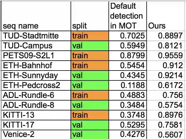 在Fast-RCNNCaffe版本的基础上我们实现了Fast RCNN模型的TensorFLow版本。我们使用MOT测试数据的一半作为训练数据,另一本作为测试数据。如表所示,我们的检测系统的性能比默认的检测系统性能高出12到52个百分点。