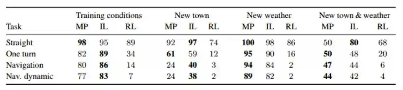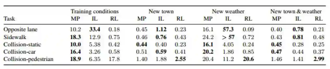 表 1:三种自动驾驶系统在目标导向导航任务中的量化测评。这张表记录了在每一种环境下每个不同的方法成功完成某个任务中的片段所占的百分比,越高越好。被测试的三种方法分别是:模块化流水线(MP)、模仿学习(IL)、以及强化学习(RL)。