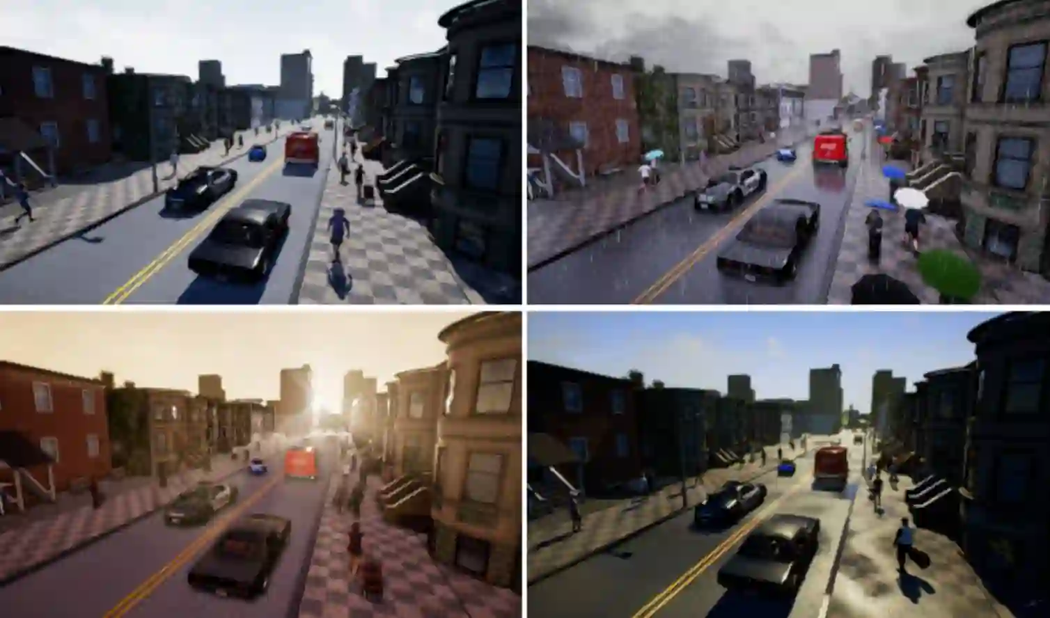 图 1:四种不同天气下城市 2 中的一条街道(第三人称视角)。从左上顺时针开始:晴天、雨天、雨后、晴朗的黄昏。在补充视频中可以看到模拟器中的录像。