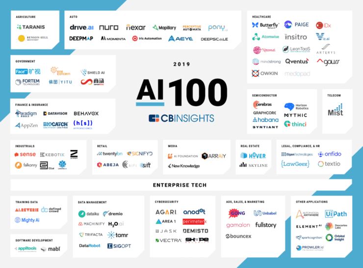 值得关注的是,在 2019 年 2 月 7 日,权威机构 CB Insights 发布了 2019 全球 Top 100 AI 创业公司年度榜单,从专利数量、投资者情况、团队实力、市场潜力、合作伙伴关系、竞争环境和创新性等方面进行评选。