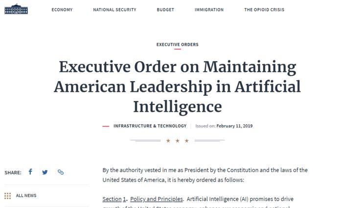 雷锋网 AI 科技评论按:美国时间 2 月 11 日,美国国家科技政策办公室发布了由总统唐纳德·J·特朗普亲自签署的《美国人工智能倡议》(American AI Initiative)。在白宫网站上,《美国人工智能倡议》被视为「行政命令」,并以《维护美国人工智能领导力的行政命令》为题向全美民众发布。