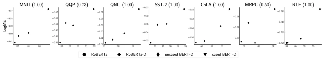 LogME并不局限于视觉模型与任务,我们还测试了它对NLP预训练模型的评价能力。可以看到,在五个任务上,LogME完美地预测了四个预训练模型的表现的相对大小,在另外两个任务上的表现也不错。