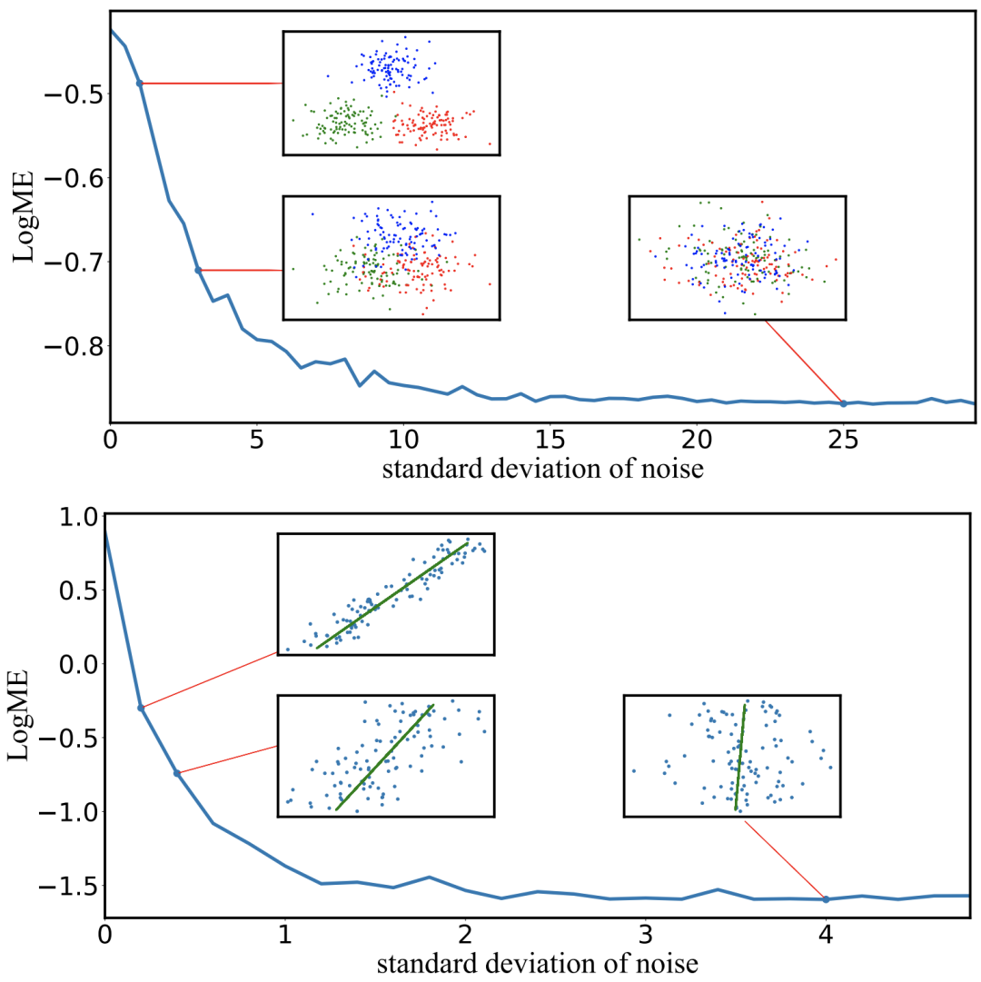 首先让我们看看,LogME给出的打分标准与人的主观感觉是否一致。我们为分类问题和回归问题分别设计了一个toy实验,使用生成数据来测量LogME的值。从下图中可以看出,不管是分类任务还是回归任务,当特征质量越来越差时,LogME的值也越来越低,说明LogME可以很好地衡量特征与标注的关系,从而作为预训练模型选择的标准。