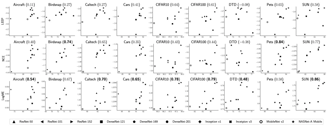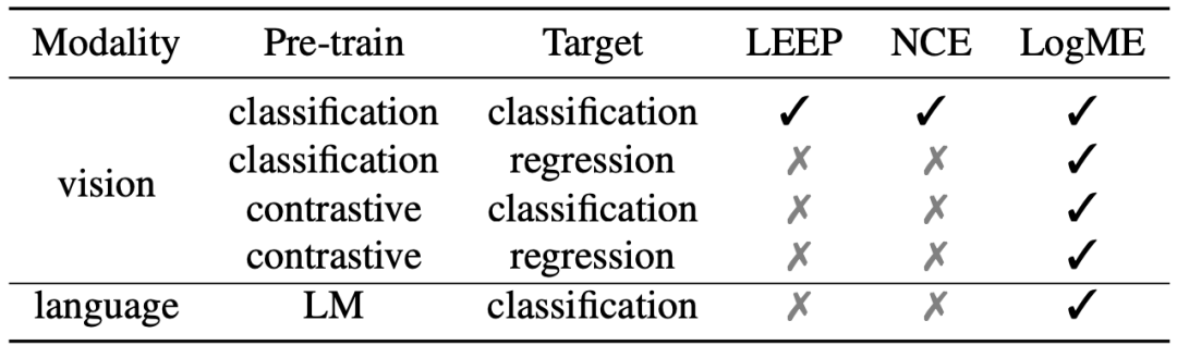 一个好的打分标准,需要在保持与ground-truth打分的高度相关性的同时,尽可能降低时间开销,才能满足实际使用的要求。除了ground-truth方法之外,目前还有两种打分方法(LEEP和NCE),但是它们的使用范围非常有限,只能用于有监督预训练模型迁移到分类任务的场景,如下表所示,而我们提出的LogME则能够胜任几乎所有常见的场景,覆盖了视觉、NLP、分类、回归、有监督预训练模型、无监督预训练模型等方向。