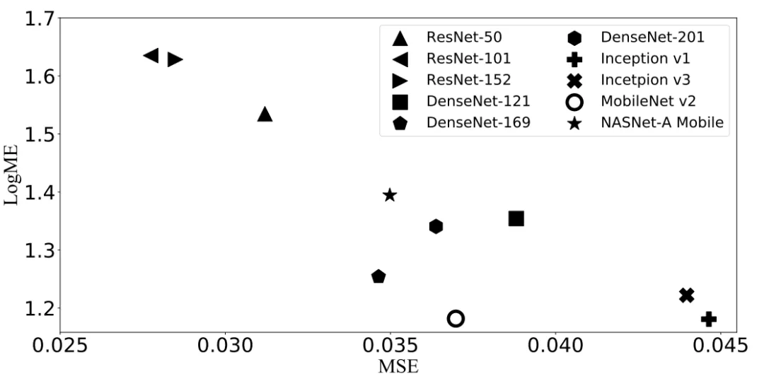 我们也做了回归任务相关的实验,可以看到LogME与MSE有明显的负相关性,而MSE是越低越好,LogME是越大越好,结果符合预期。