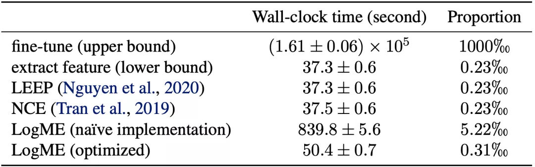 值得注意的是,像LogME这种根据概率公式计算的方法,一般效果更好,但是耗时也更高。事实上,如果我们采用简单粗暴的实现,评估一个模型就需要八百多秒。正是有了精心优化的版本,我们才能够既有概率方法的优越效果,又有简单高效的实现。