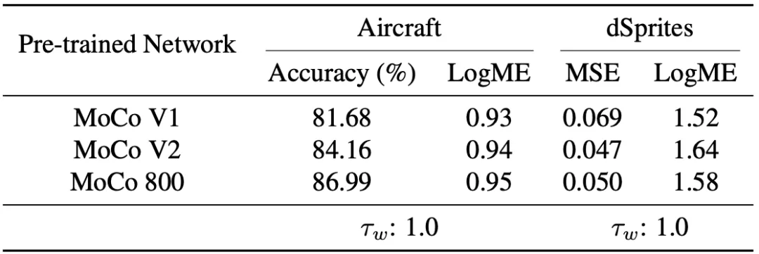 在2020年,视觉领域的重要进展之一就是无监督预训练模型。因此我们也尝试了使用LogME来判断无监督预训练模型的质量。从下图的结果来看,不论是分类任务(Aircraft)还是回归任务(dSprites),LogME都能准确衡量无监督预训练模型的质量。