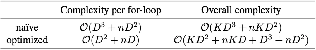 值得一提的是,LogME算法涉及到很多矩阵分解、求逆、相乘操作,因此一不小心就容易使得算法的复杂度很高(例如上图第9行,粗糙的实现方式)。我们在深入研究该算法后发现,很多矩阵运算的开销可以通过巧妙的计算优化手段大大降低,因此将计算流程优化为上图第10行,整体的计算复杂度降低了一个阶,从四次方降低为三次方(见下表),使得该算法在数秒内就能处理常见情况。