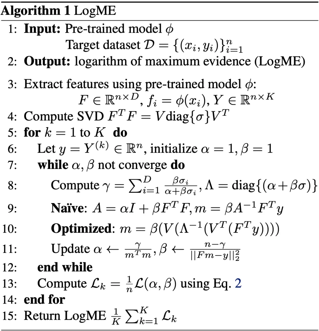我们选用的是统计学中的证据(evidence,也叫marginalized likelihood)来衡量特征与标注的关系。它不使用某个特定的 的值,而是使用的分布来得到边缘化似然的值。它相当于取遍了所有可能的 值,能够更加准确地反映特征与标注的关系,不会有过拟合的问题。其中, 与 分别由超参数 和 决定,但是它们不需要grid search,可以通过最大化evidence来直接求解。于是,我们就得到了对数最大证据(Log Maximum Evidence, 缩写LogME)标准来作为预训练模型选择的依据。具体数学细节不在这里赘述,感兴趣的读者可以阅读底部的论文。算法的具体细节在下图中给出了。注意,虽然LogME计算过程中将预训练模型 视作特征提取器,但是LogME可以用于衡量 被用于迁移学习(微调)的性能。