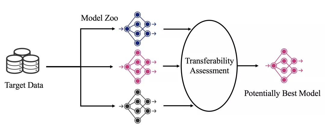 预训练模型选择问题,就是针对用户给定的数据集,从预训练模型库中选择一个最适合的预训练模型用于迁移学习。其流程可以简单概括为下图,核心就是要对每一个预训练模型进行迁移性评估(Transferability Assessment),简单来说就是为每个模型打分,然后选择出打分最高的预训练模型。