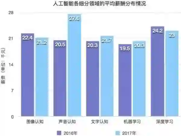 据透露,目前人工智能研究方向毕业的博士初始年薪就可以达到30万元。其中,管理岗薪酬最高,平均达到23k,数据开发和人工智能紧随其后,都在20k以上。具体细分来看,声音认知是人工智能的新热门领域,其他岗位求职者数量增加导致薪水趋于平稳,而声音认知一枝独秀,薪资涨幅领先,平均薪酬从2016年的20.5k增长到2017年的27.6k。