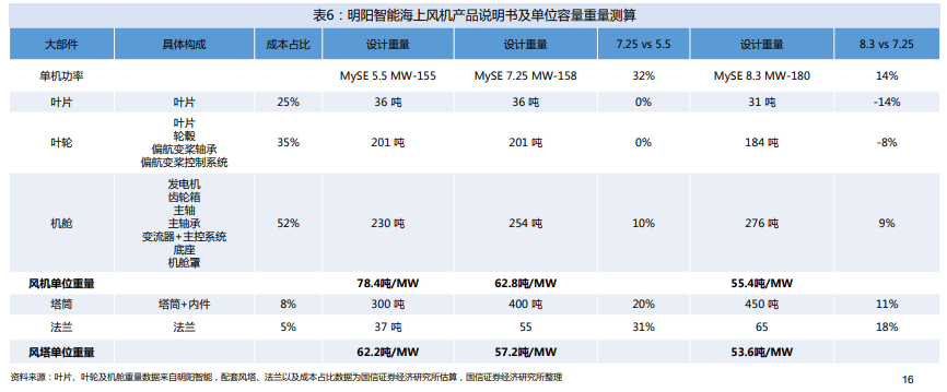 以明阳智能海上风机系列产品为例,如图1,当风机从5.5MW升级到8.3MW,尽管配套的叶轮直径从155米放大到180米,但整体物料成本依然有明显下降,单位容量的成本得到有效降低。