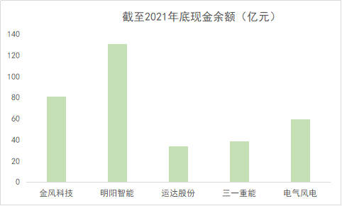 如图,在资产负债率方面,包括金风科技、明阳智能在内的龙头明显低于运达股份、电气风电、三一重能等第二梯队厂商。现金流方面,截至2021年底,明阳智能的现金余额高达131亿元,同期电气风电的现金余额仅为60亿元,运达股份、三一重能的现金余额不及40亿元。