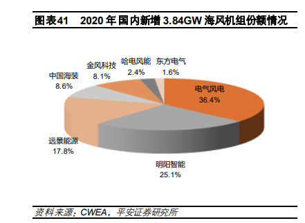 近年来明阳智能在海上风电领域快速扩张,市场份额持续提升。根据GWEC数据,在2020年全球海上风机吊装市场,明阳智能占据14.7%的市场份额,全球排名第四。根据CWEA数据,在2020年国内新增海风机组中,明阳智能占据25.1%的份额,排名第二,远超远景能源、金风科技等。