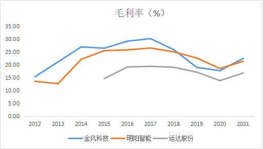 在盈利能力方面,短期来看,以业务结构较为相近的金风科技、运达股份、电气风电三家公司作为对比,2021年,明阳智能的收入、净利润规模及毛利率仅次于金风科技,但远高于运达股份、电气风电。