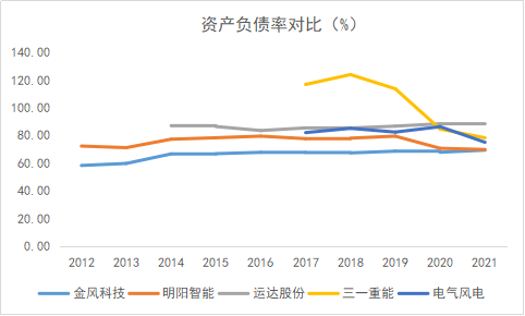 风机制造属于重资产、资金密集型产业,从投产到盈利的整体周期相对较长。在这种背景下,参与者需要进行相当大的前期投入,且达到一定规模后才能产生效益。在此基础上,持续的价格战导致行业利润空间一再缩水,再加上受风电场建设周期等因素的影响,下游回款周期长,“借钱经营”由此成为风机厂商的常态,进而也使得风机厂商的资产负债率常年居高,资金压力较大。